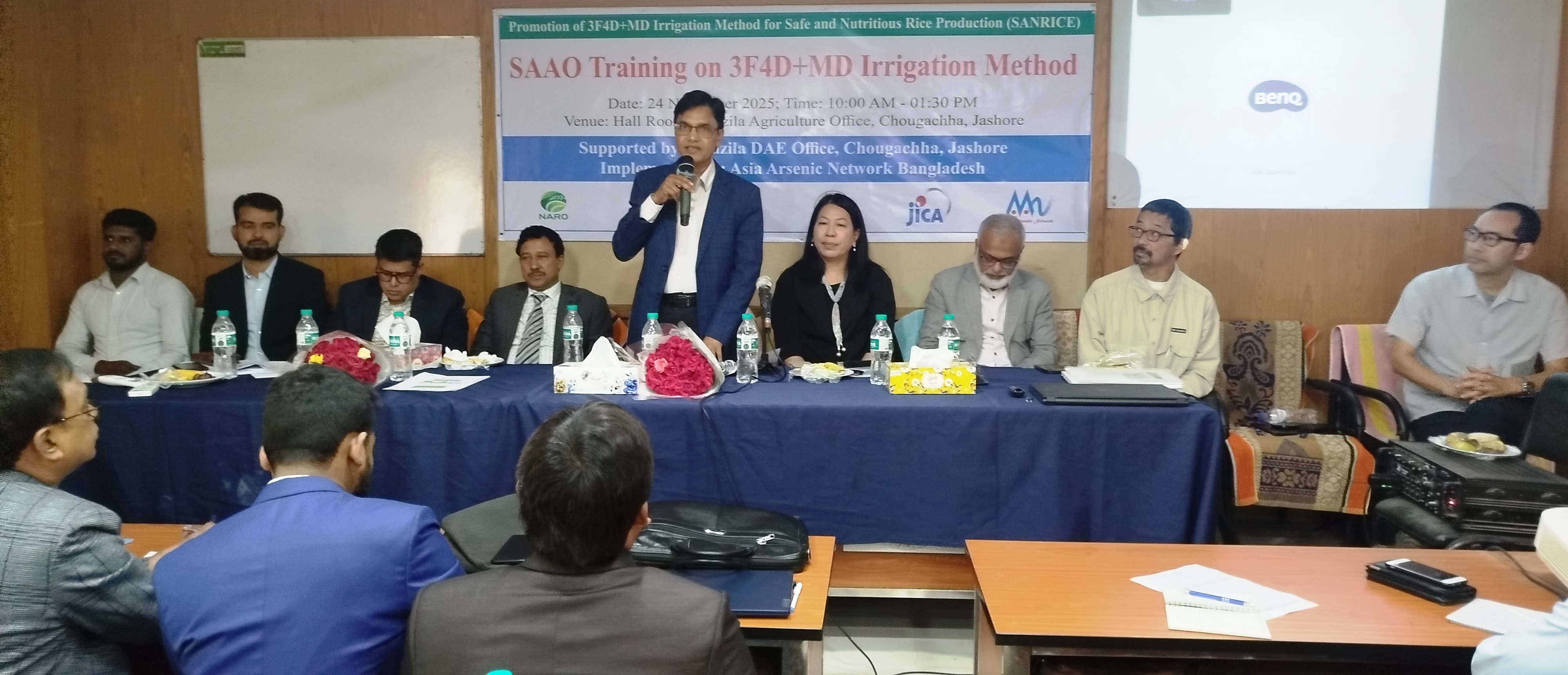 প্রযুক্তিটি মাঠ পর্যাযে প্রয়োগে সফলতার জন্য ‘নিরাপদ ও পুষ্টিকর ধান উৎপাদনের জন্য প্রজনন ও পানি ব্যবস্থাপনা প্রযুক্তির উন্নয়ন’ বিষয়ে ২৪ নভেম্বর সকাল ১০টায় উপজেলা কৃষি অফিস হলরুমে উপসহকারী কৃষি অফিসারদের এক প্রশিক্ষণ অনুষ্ঠিত হয়েছে। কৃষি সম্প্রসারণ অধিদপ্তর যশোর অঞ্চলের অতিরিক্ত পরিচালক আলমগীর বিশ্বাস প্রশিক্ষণের উদ্বোধনকালে বলেন, কৃষি সমৃদ্ধ অঞ্চল হিসেবে যশোর অঞ্চলের খ্যাতি রয়েছে। ভূ-গর্ভস্থ সেচ নির্ভর ফসল চাষাবাদের কারণে প্রতিবছর ০.৭ ফুট ভূ-গর্ভস্থ পানির স্তর নীচে নেমে যাচ্ছে। ফলে চাউলে আর্সেনিক ও ক্যাডনিয়ামের মতো ক্ষতিকর রাসয়নিকের উপস্থিতি সনাক্ত হয়েছে। পাশাপাশি পানিতে আয়রনের পরিমাণও বেড়ে গেছে। তিনি জাপান উদ্ভাবিত 3F4D+MD প্রযুক্তিটি সেচ সাশ্রয়সহ বোরো ধান চাষ অধিক লাভজনক ও কার্যকর হবে বলে আশা প্রকাশ করেন।